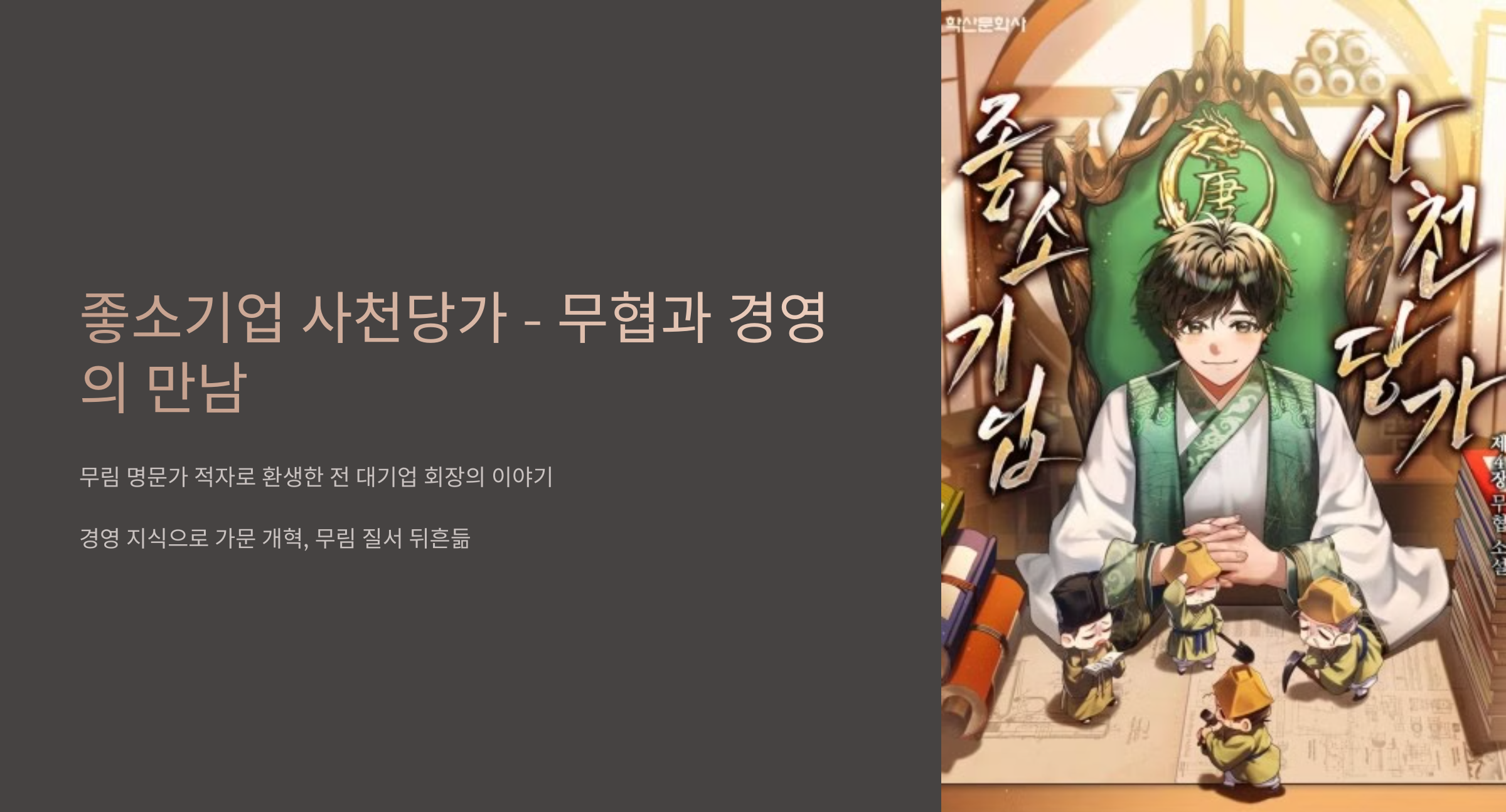 🔥 "좋소기업 사천당가"는 무협과 현대 경영이 결합된 신선한 환생 무협 소설입니다.