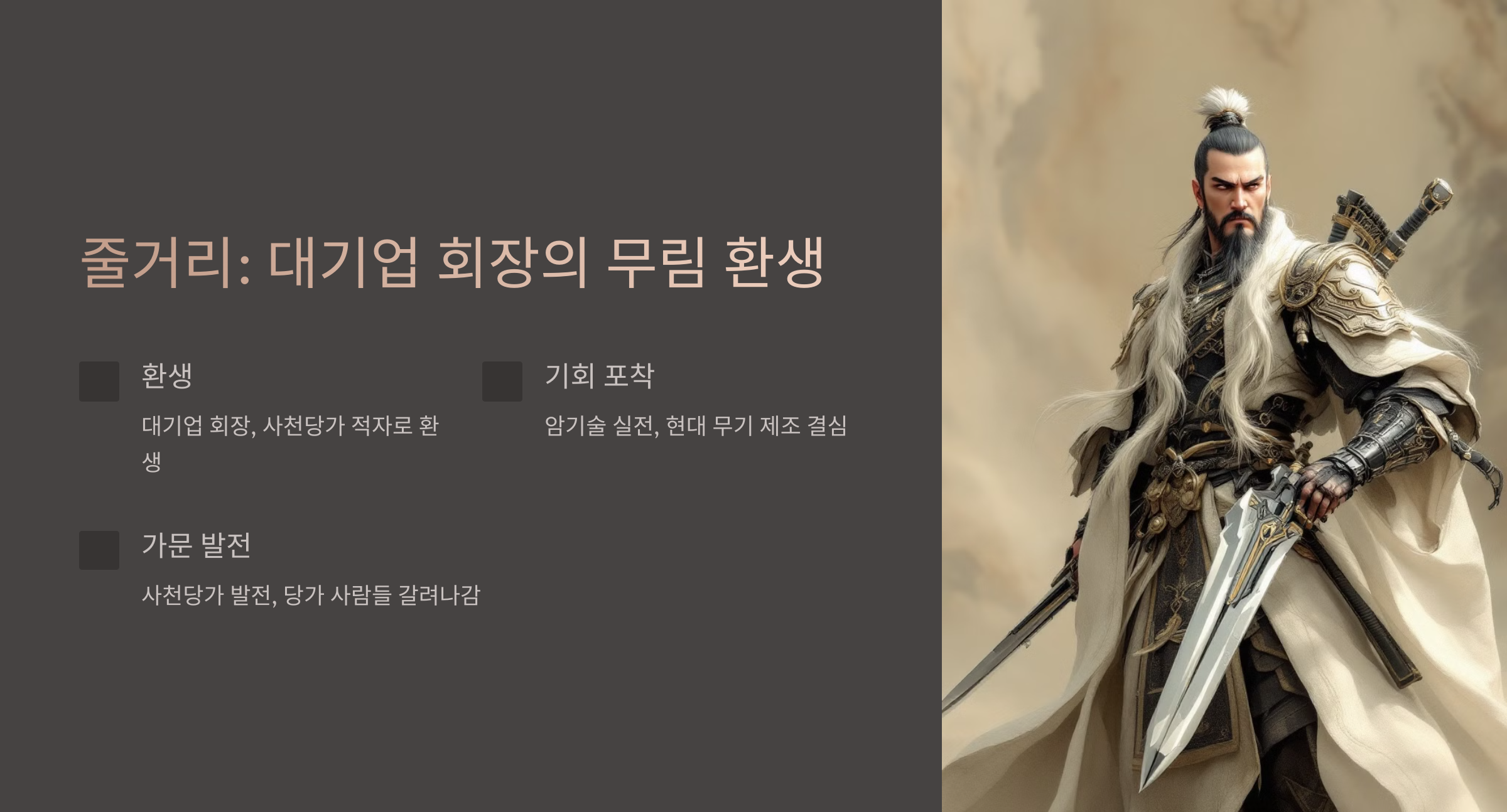 🔥 줄거리 - 대기업 회장, 무림 명문가로 환생하다!